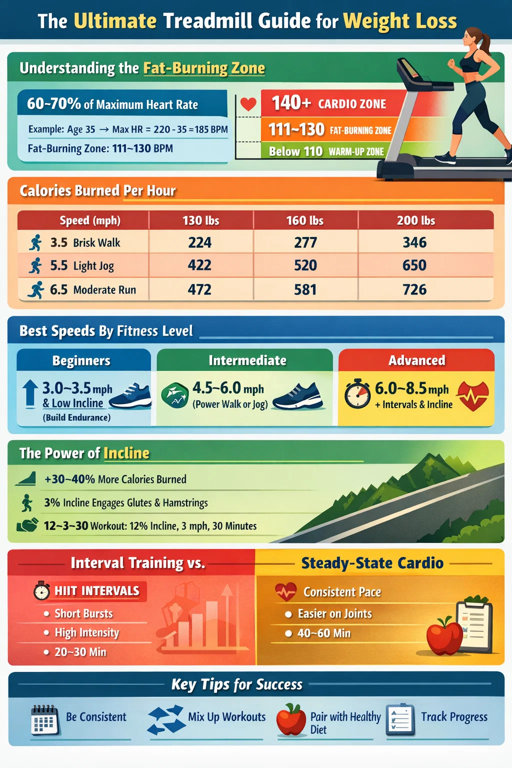 Une personne de 180 livres marchant à 3,5 mph brûle environ 314 calories par heure. La même personne qui fait du jogging à 5,5 mph brûle plus de 633 calories par heure. La vitesse compte, mais la cohérence, la durée et la structure de l’entraînement comptent tout autant. Les sections ci-dessous détaillent tout cela en termes pratiques.