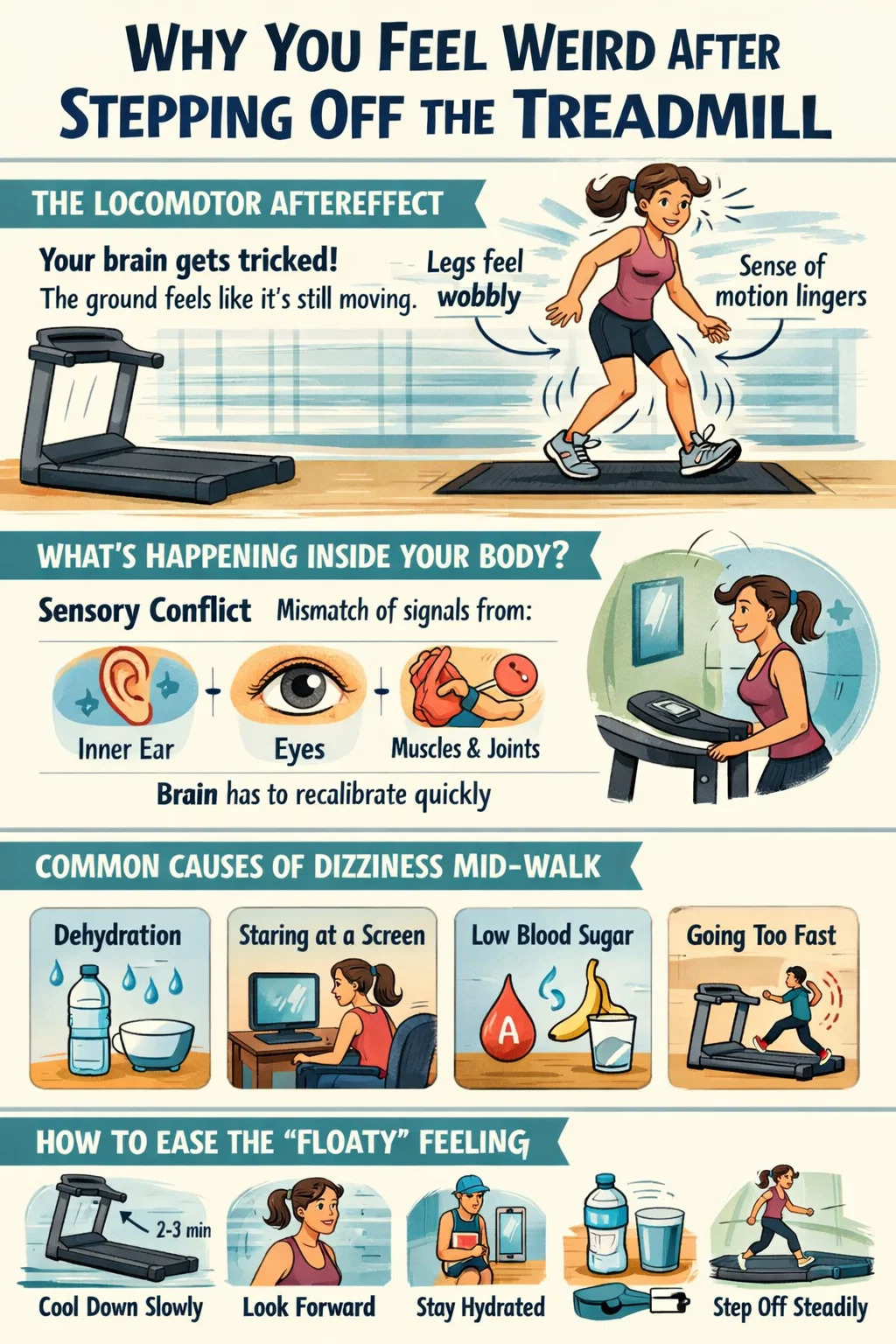 À l’extérieur, lorsque vous avancez, vos yeux voient l’environnement changer derrière vous, vos jambes bougent et votre oreille interne détecte un mouvement vers l’avant. Sur un tapis roulant, vos jambes bougent, mais vos yeux voient un mur ou un écran fixe et votre oreille interne enregistre peu ou pas de déplacement vers l'avant. Votre cerveau doit réconcilier ces entrées incompatibles, et il le fait, mais l'ajustement persiste après votre arrêt.